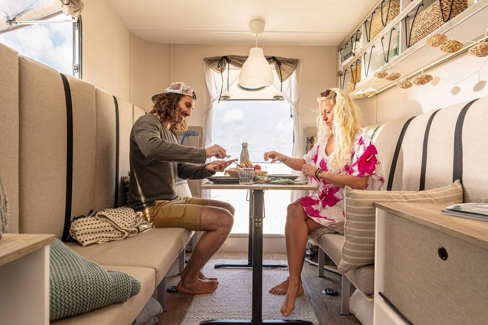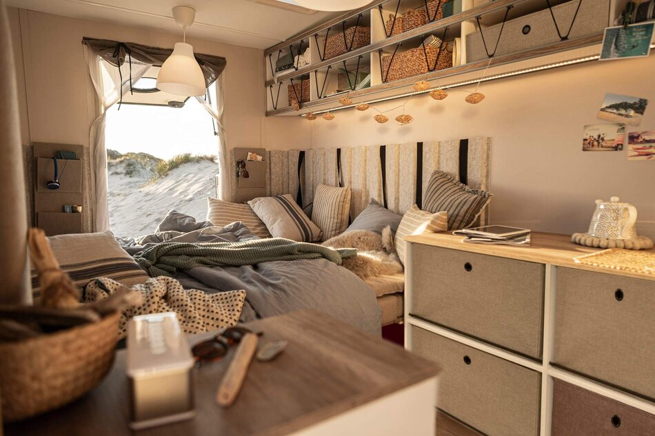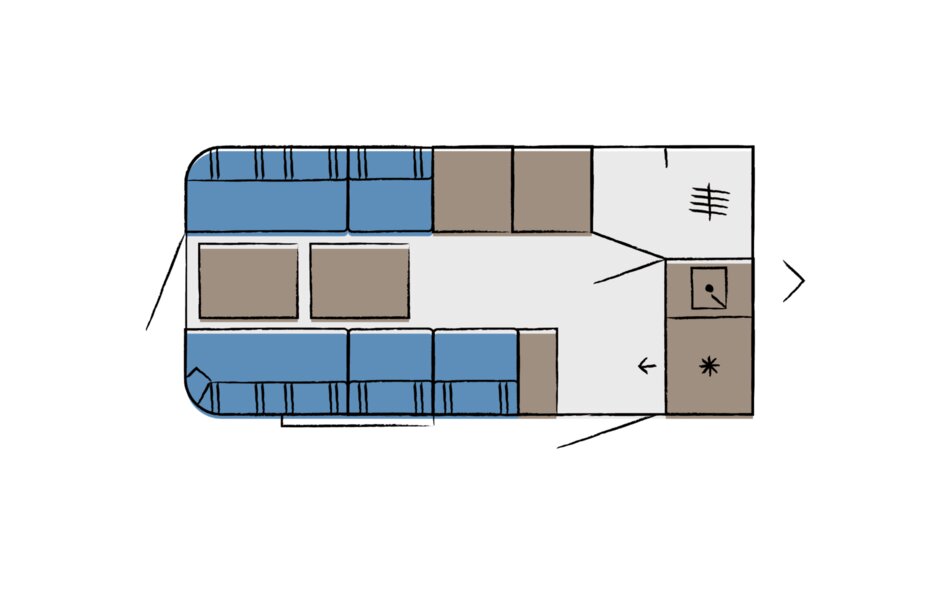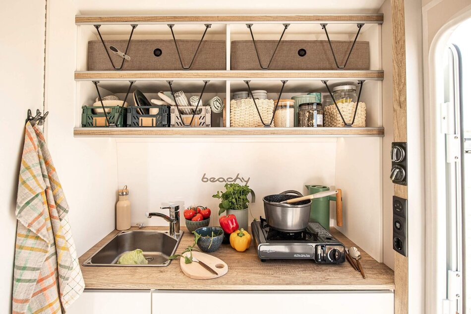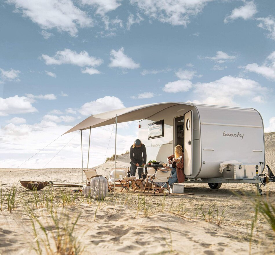 Meer opbergruimte en extra slaapruimte: de BEACHY 420 is perfect voor gezinnen met één grotere of twee kleinere kinderen. Zoals alle modellen is hij modulair opgebouwd en daardoor buitengewoon veelzijdig. Een compacte keuken en een inloopkast met een grote spiegel, die optioneel kan worden uitgerust met een Porta Potti, zijn all-inclusive.