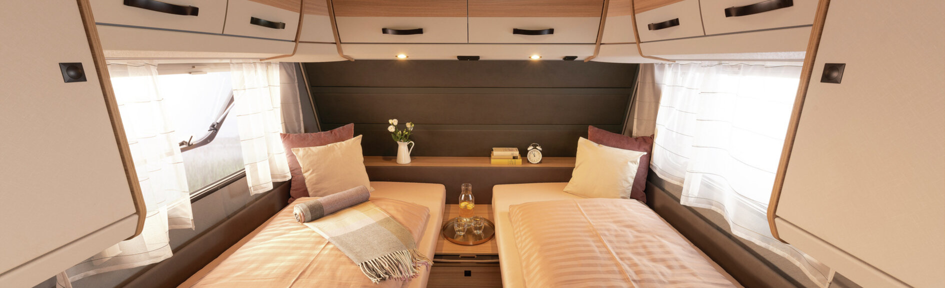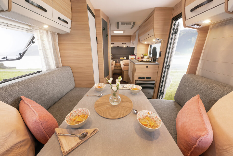 Summer Edition Stijl: Deze speciale uitvoering valt op door zijn stoere lichtgrijze zijwanden en fris interieur met moderne accenten – een lust voor het oog op elke camping.