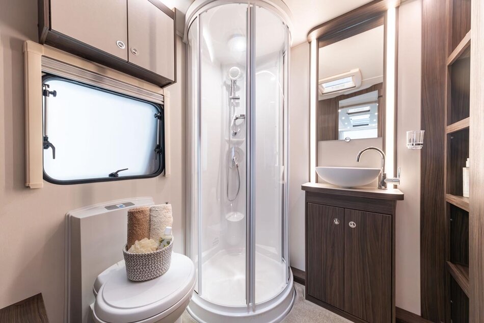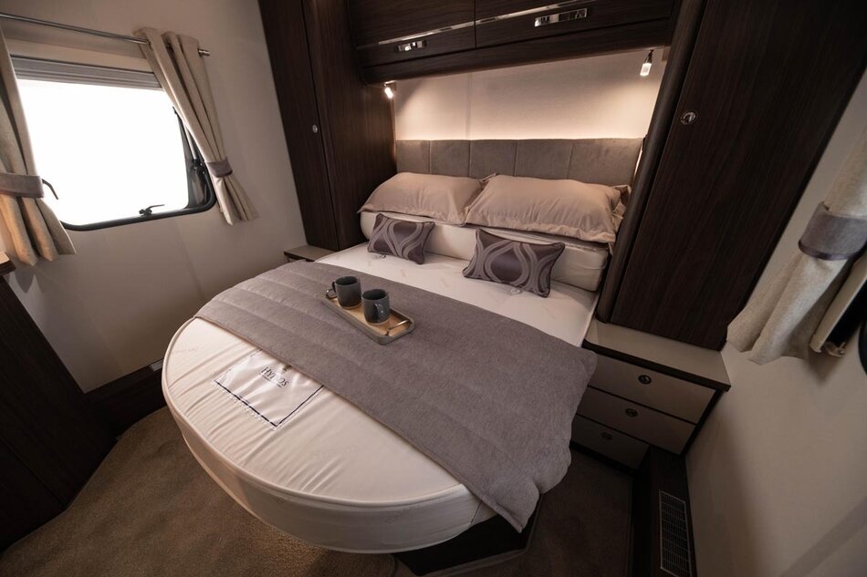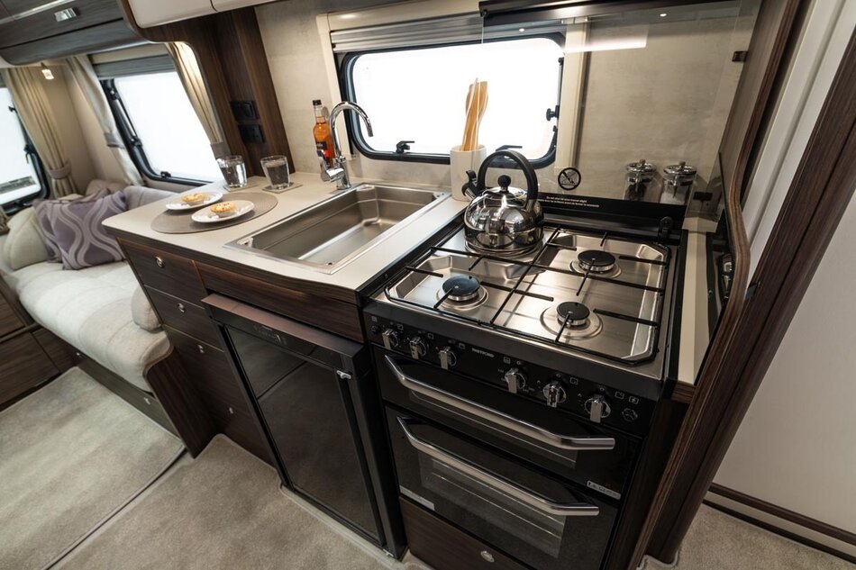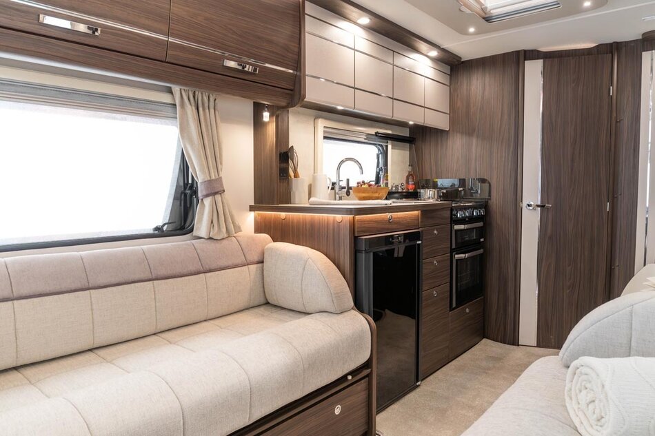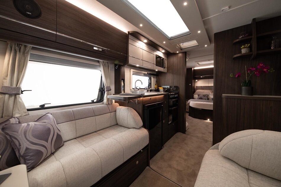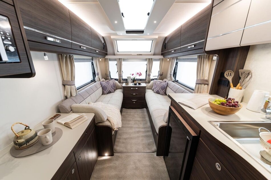 De Affinity serie omvat 3 modellen. deze zeer populaire luxere serie kenmerkt zich door een hoger specificatie niveau. Het grote onderscheid zit voornamelijk in het Alde verwarming en warmwater systeem. De caravan warmt als het ware geheel op zonder enig geluid, door radiatoren. Behaaglijk en zeer comfortabel. het interieur is uitgevoerd in een prachtige walnut houtkleur gecombineerd met lichtere accenten. Overdag geeft het grote langwerpige dakraam een mooie lichtinval. 's Avonds zorgt de sfeervolle LED verlichting voor een gezellige ambiance.