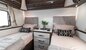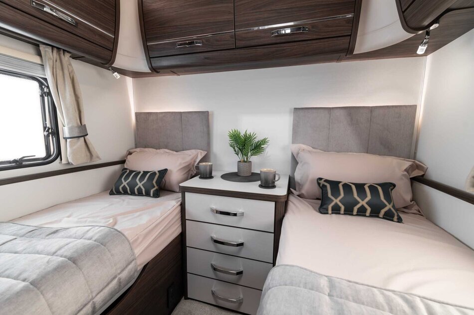In het achterste gedeelte van de caravan vind je twee comfortabele enkele bedden, ideaal voor een goede nachtrust zonder elkaar te storen. Aan de voorkant is de ruime dinette uitgerust met twee lange banken die je in een handomdraai omtovert tot een extra tweepersoonsbed, perfect voor gasten of kinderen.