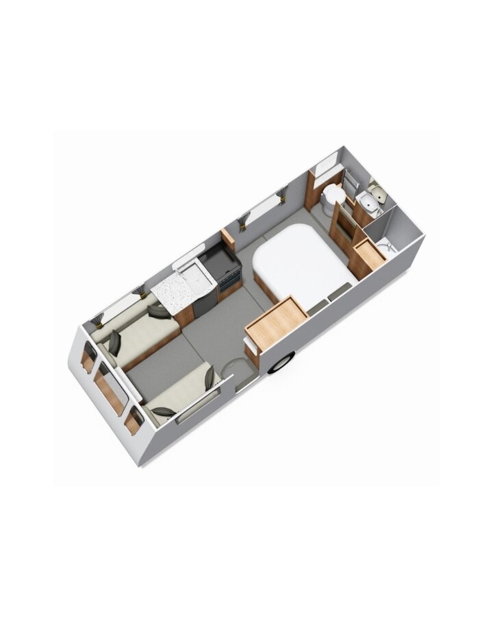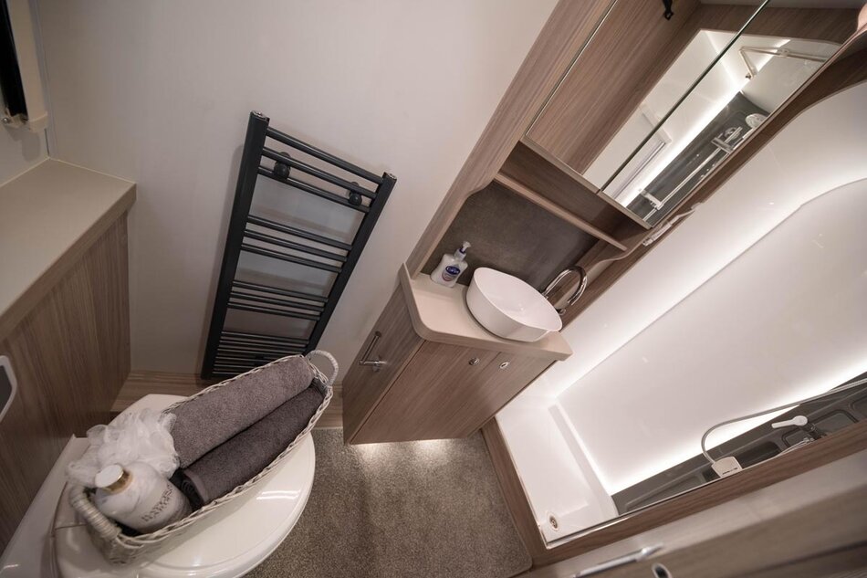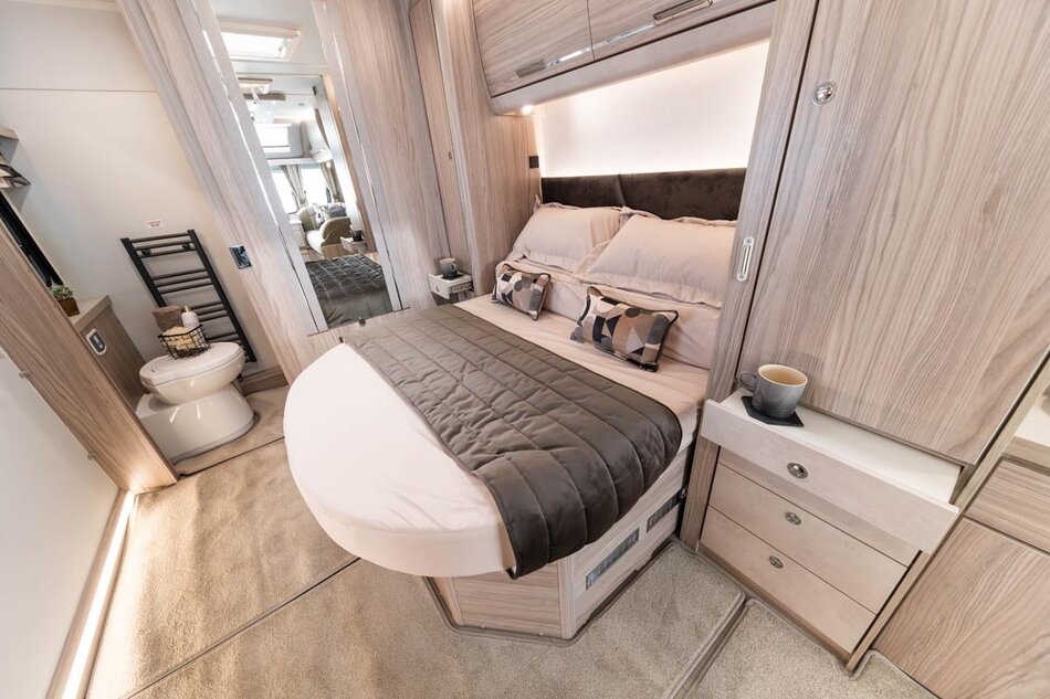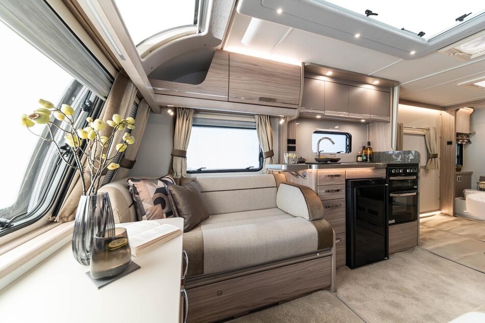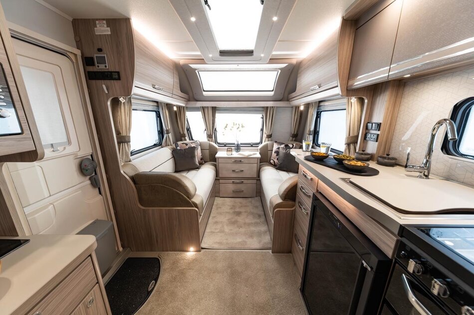 Het interieur is uitgevoerd in een nieuwe lichte houtkleur, een lang dakraam, softclose laden en kastdeuren, dakventilator. Alde verwarming met design badkamer radiator, keukenwand afwerking in acrylaat. Werkelijk alles straalt luxe uit. De buitenzijde kenmerkt zich door een unieke beige metallic kleur met nieuwe graphics.