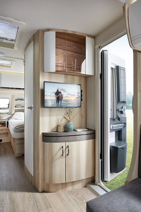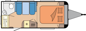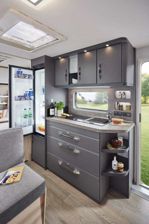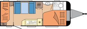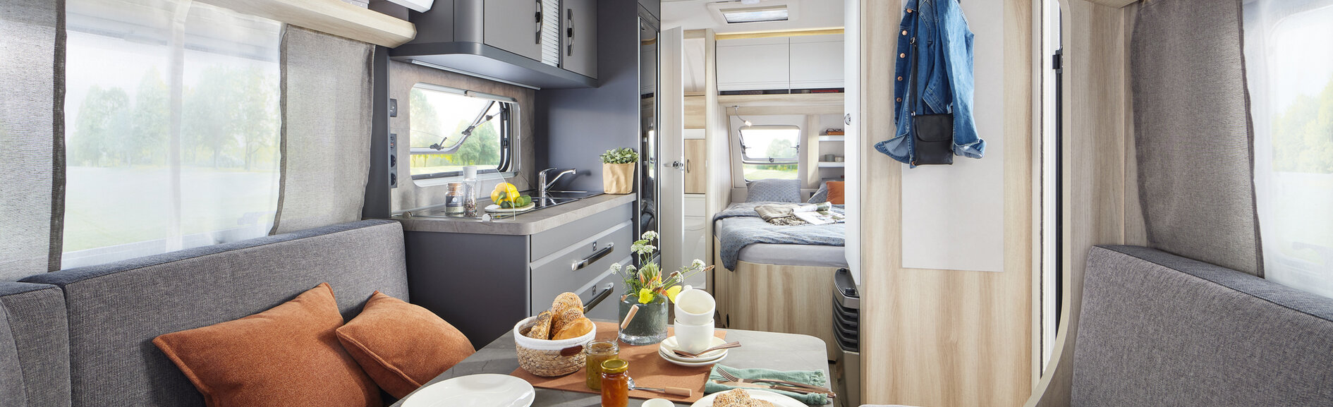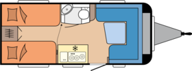 De indeling is slim: u beschikt over twee comfortabele enkele bedden die u eenvoudig kunt scheiden of samenvoegen tot een royaal bed. De knusse tweepersoons dinette is ideaal voor een snelle maaltijd of als werkplek. En met de gigantische 133 liter koelkast bent u altijd voorzien van koude drankjes en verse proviand, waar u ook staat!