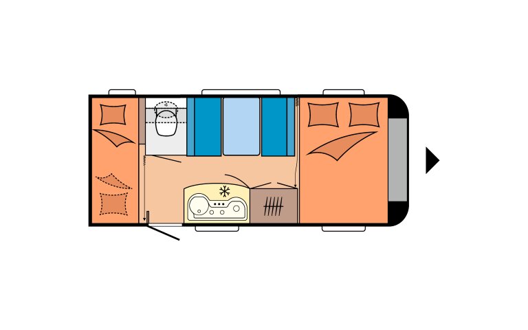 Gezellige 4-Persoons Dinette in het Midden: Het hart van de caravan is de ruime en flexibele 4-persoons dinette. Hier geniet je samen van maaltijden, speel je spelletjes of plan je de volgende dag. Deze dinette kan ook eenvoudig omgebouwd worden tot een extra slaapplaats, mocht dat nodig zijn.
