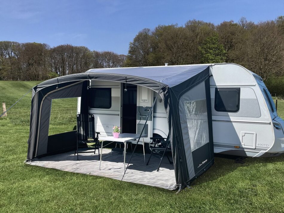 Standaard geleverd met luchtpomp en 2 stalen staanders om de wanden tegen de caravan aan te kunnen drukken.