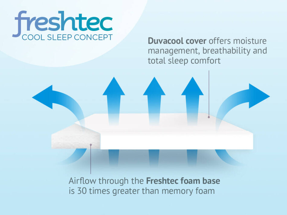 De Duvalay luxe slaapzak Freshtec is ons meest verkoelende slaapsysteem. Het ‘Cool Sleep Concept’ van Freshtec zorgt voor veel ventilatie waardoor de warme lucht en vocht afgevoerd kan worden. De verkoelende topper is geschikt voor gebruikers die het ’s nachts vaak warm hebben.