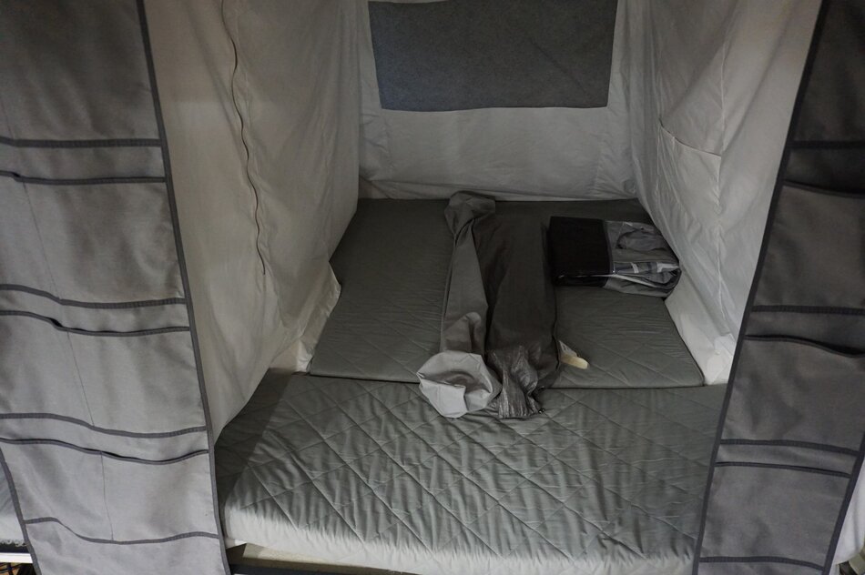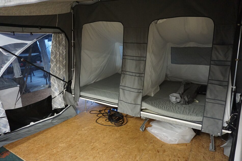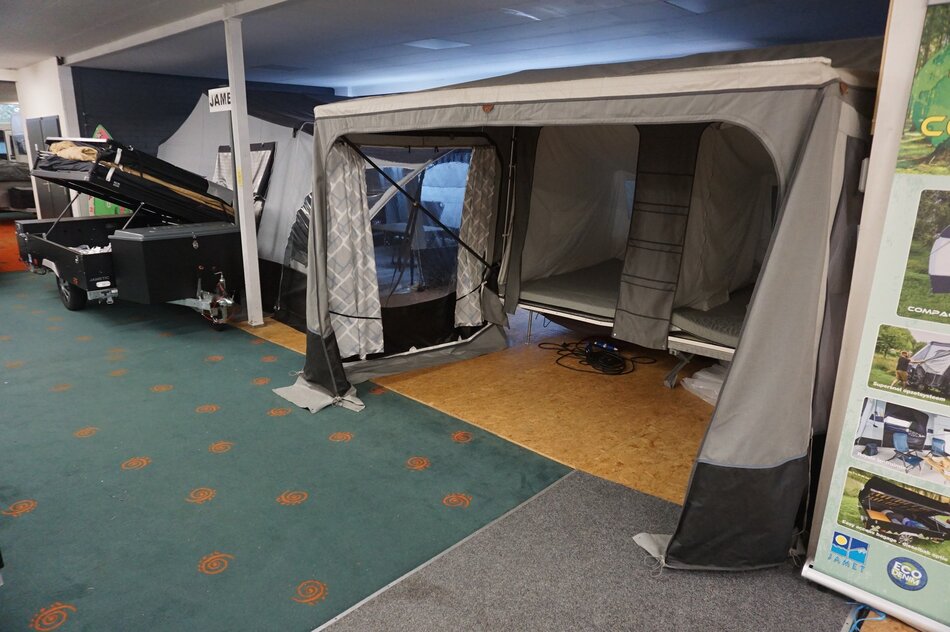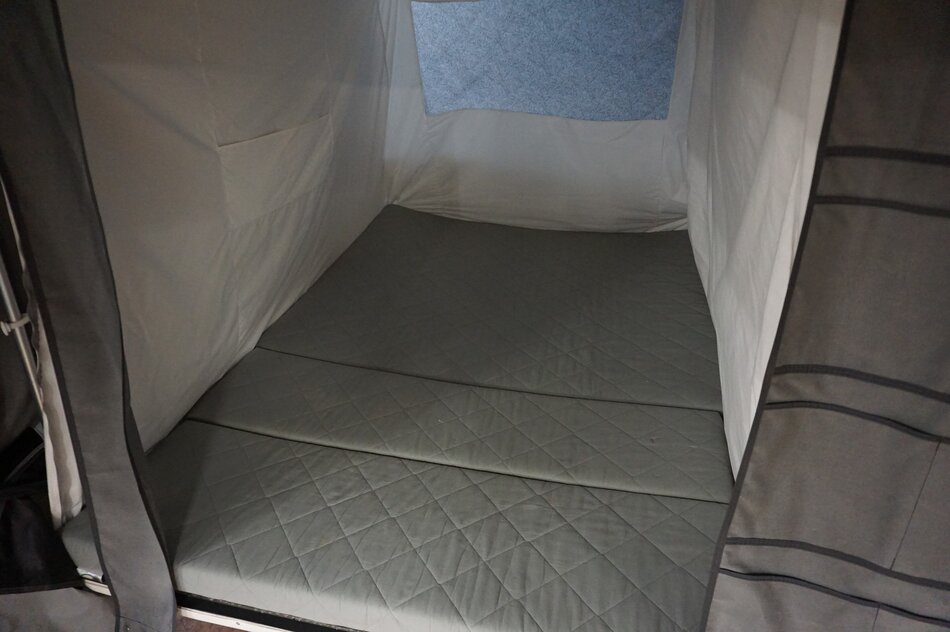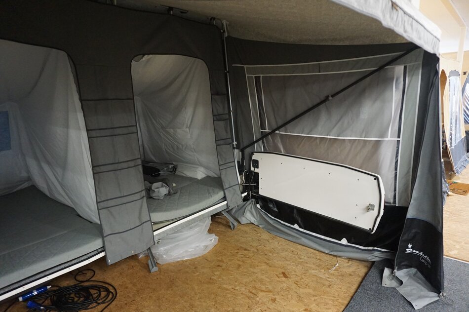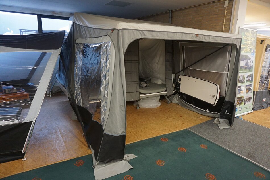 Compleet met mooie living plus luifel, extra grote disselbak met dubbele bodem, luxe bagagezak op het deksel, kuipgrondzeil, aqua matten onder de matrassen, etc.