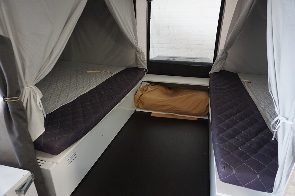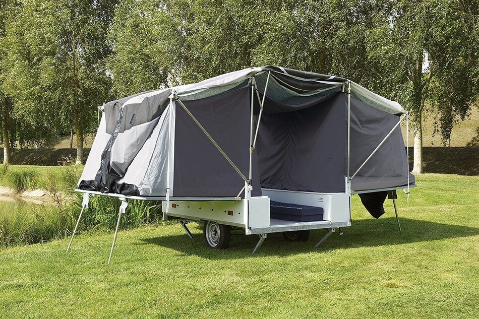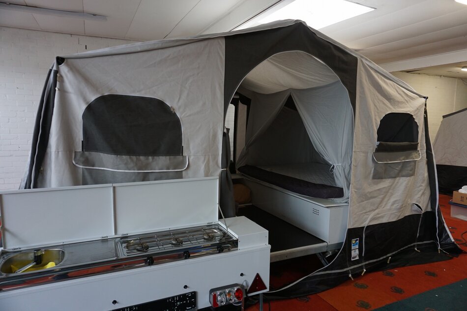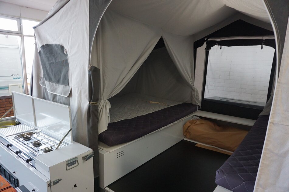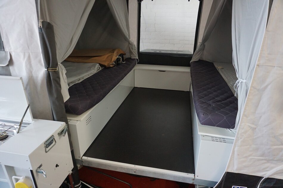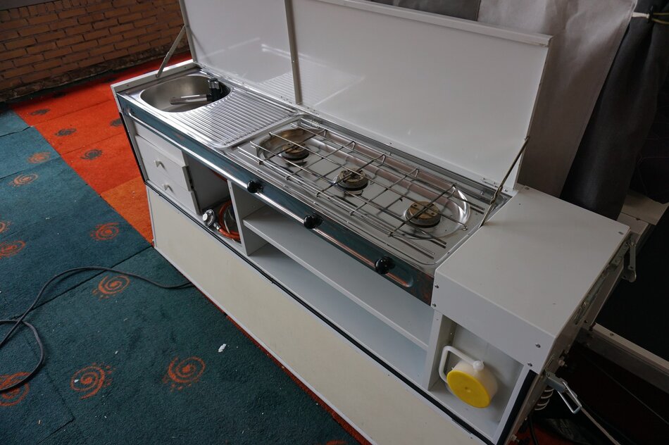 Symmetrisch uitvouwsysteem: een klassiek 2-kamer systeem waarbij de bedden boven de wagenbak uitvouwen. De wagen is uitgerust met een luxe bermkeuken voorzien van 3-pits gasstel, spoelbak en kraantje.