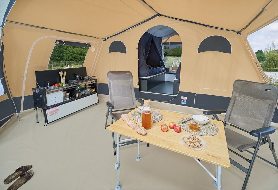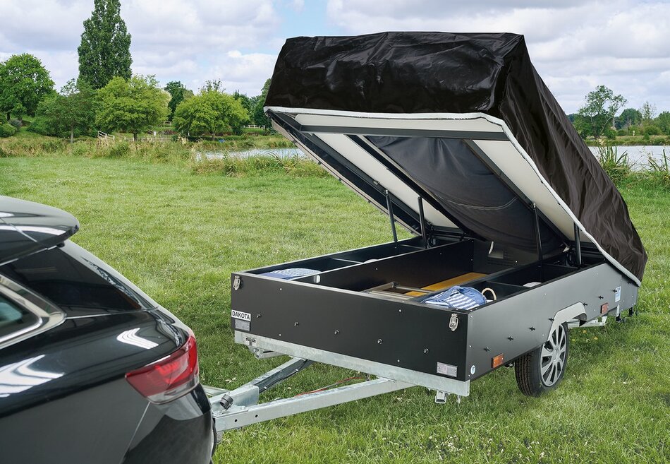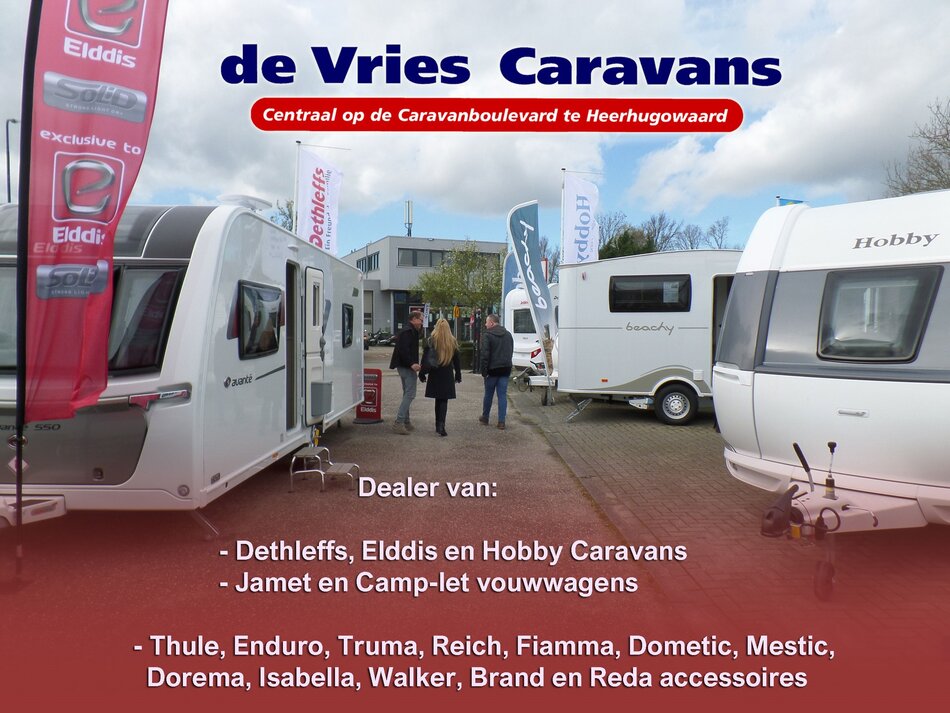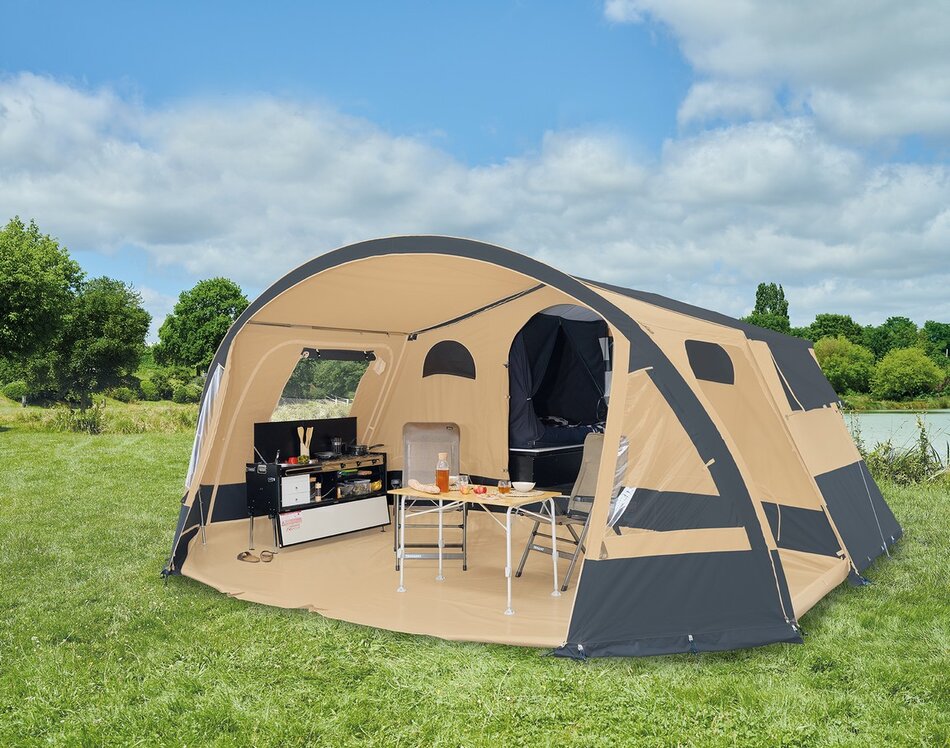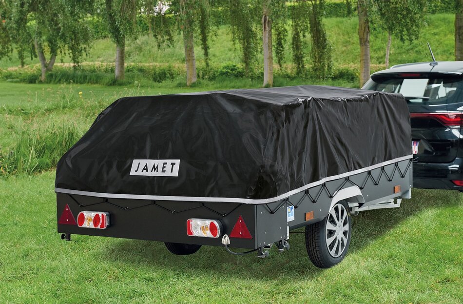 Jamet Dakota Outdoor in de nieuwe kleuren beige en een zwarte wagen. Ruime boogvoortent met inrits grondzeil. Wordt geleverd inclusief luifel en gratis grote disselbak.