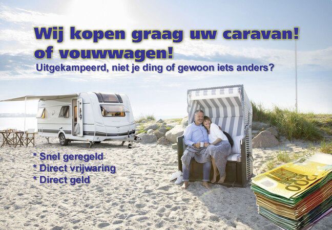 De Vries Caravans is continu op zoek naar jonge gebruikte caravans en vouwwagens. Vul daarom (geheel vrijblijvend) ons inkoopformulier op onze website in, dan zullen wij zo snel mogelijk contact met u opnemen! Vrijwaring en betaling direct geregeld!