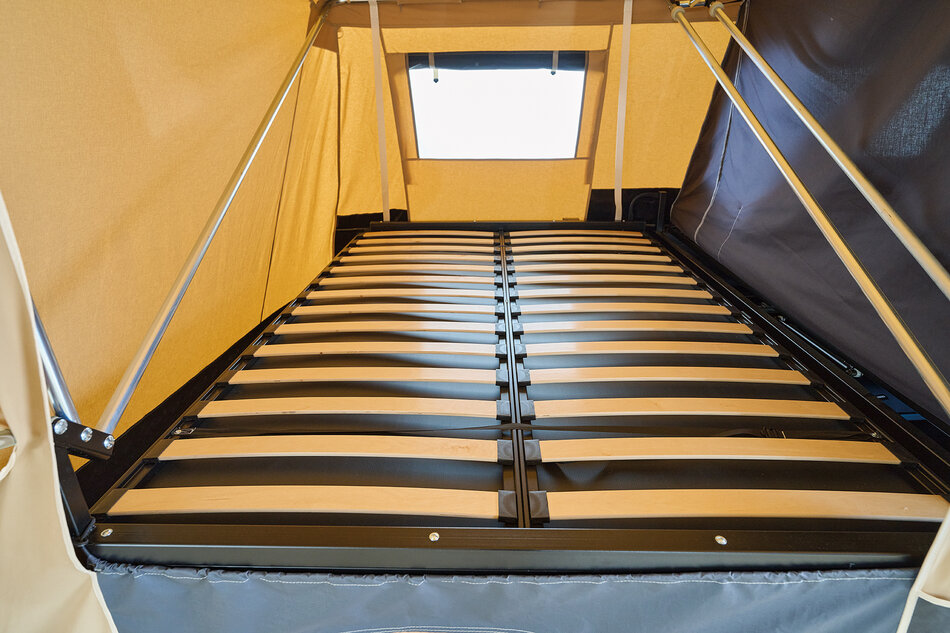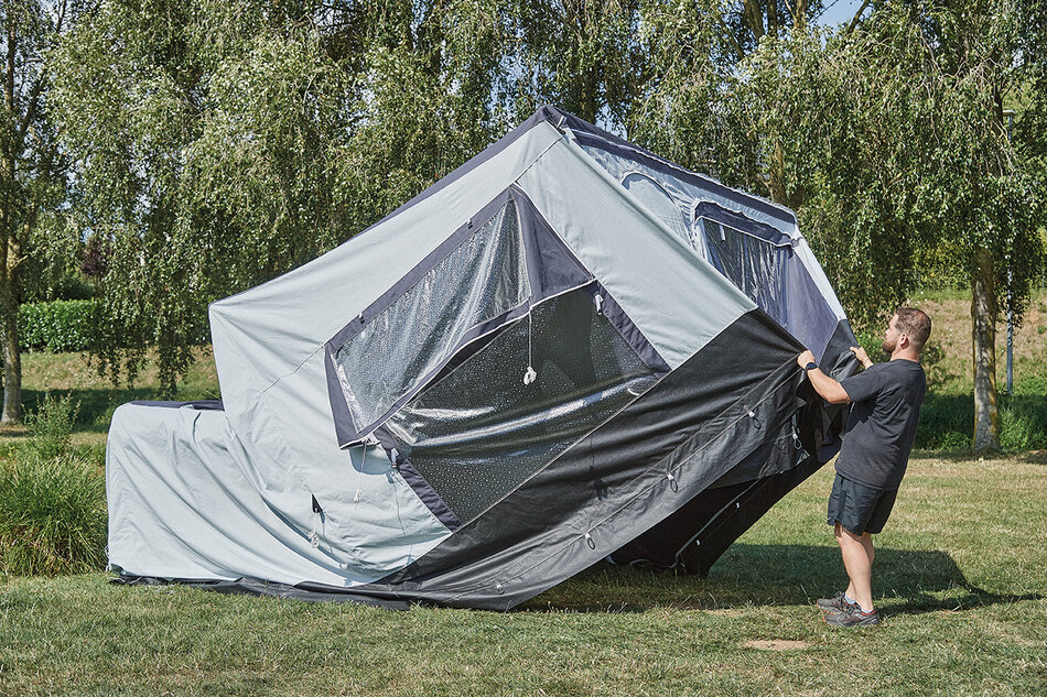 Nieuwe kleuren van de wagen en tentdoek! De populaire Jametic modellen (4 tot 6 persoons) hebben een supersnel ”1-2-3 klaar” opzetsysteem voor wagentent en voortent, al jarenlang een topmodel in de Jamet-collectie. De wagentent in de vernieuwde kleuren gecombineerd met de voortent is makkelijk op te zetten dankzij een extra gasdruk-opzethulpveer aan de latten bodem! Deze gasdrukveer zorgt ervoor dat het open klappen vederlicht gaat. Wagentent en voortent zet u in drie handelingen volledig op hierna spant u de wagen af. Nu nieuw in dit model is de standaard dubbele latten bodem met gasdempers en het easy access systeem. Hierdoor kunt u de wagen makkelijk van binnenuit en vanaf de zijkant beladen, zonder de tent op te hoeven zetten.