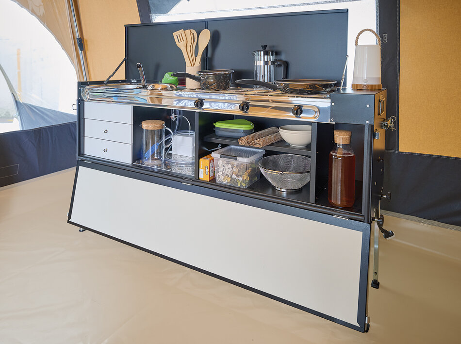 De standaard luxe achterkeuken voorzien van rvs 3 pits kooktoestel , 12 volt watervoorziening, veel bergruimte en 2 opberglades.