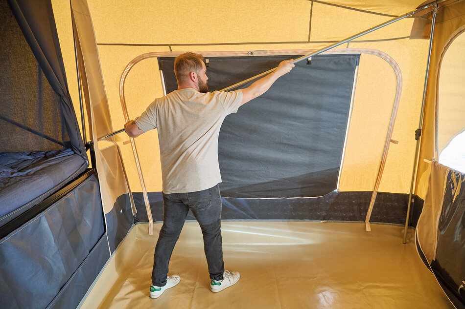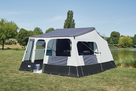 De Jametic Outdoor is uitgevoerd in nieuwe tentkleuren van een combinatie van ecologisch ecru tentdoek met donkergrijs-kleurige accenten en met een beige synthetisch/afwasbaar All-Season dak (dus minder besmettelijk!). De spatrand en slikrand zijn in zwart-kleurig pvc uitgevoerd. Het grondzeil is ecru. Het interieur is ecru met fraaie donkergrijze slaapcabines voor optimaal slaapcomfort. In het accessoires pakket zijn de schokbrekers meegenomen, hiermee is de weg vrij voor de aanvraag 100 km/uur voor de Duitse autobahn.